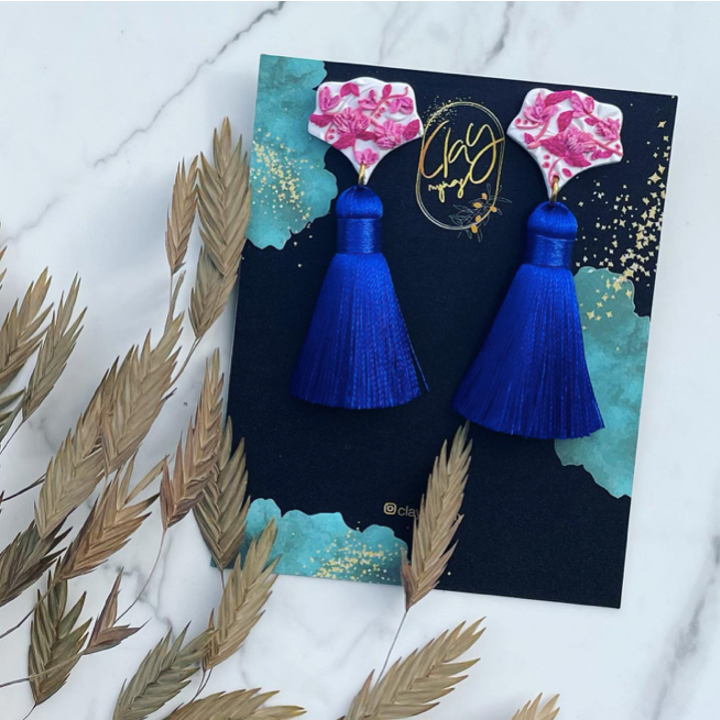 Inspired by China porcelain, the floral patterns were done up in shades of pink to contrast the royal blue tassels.